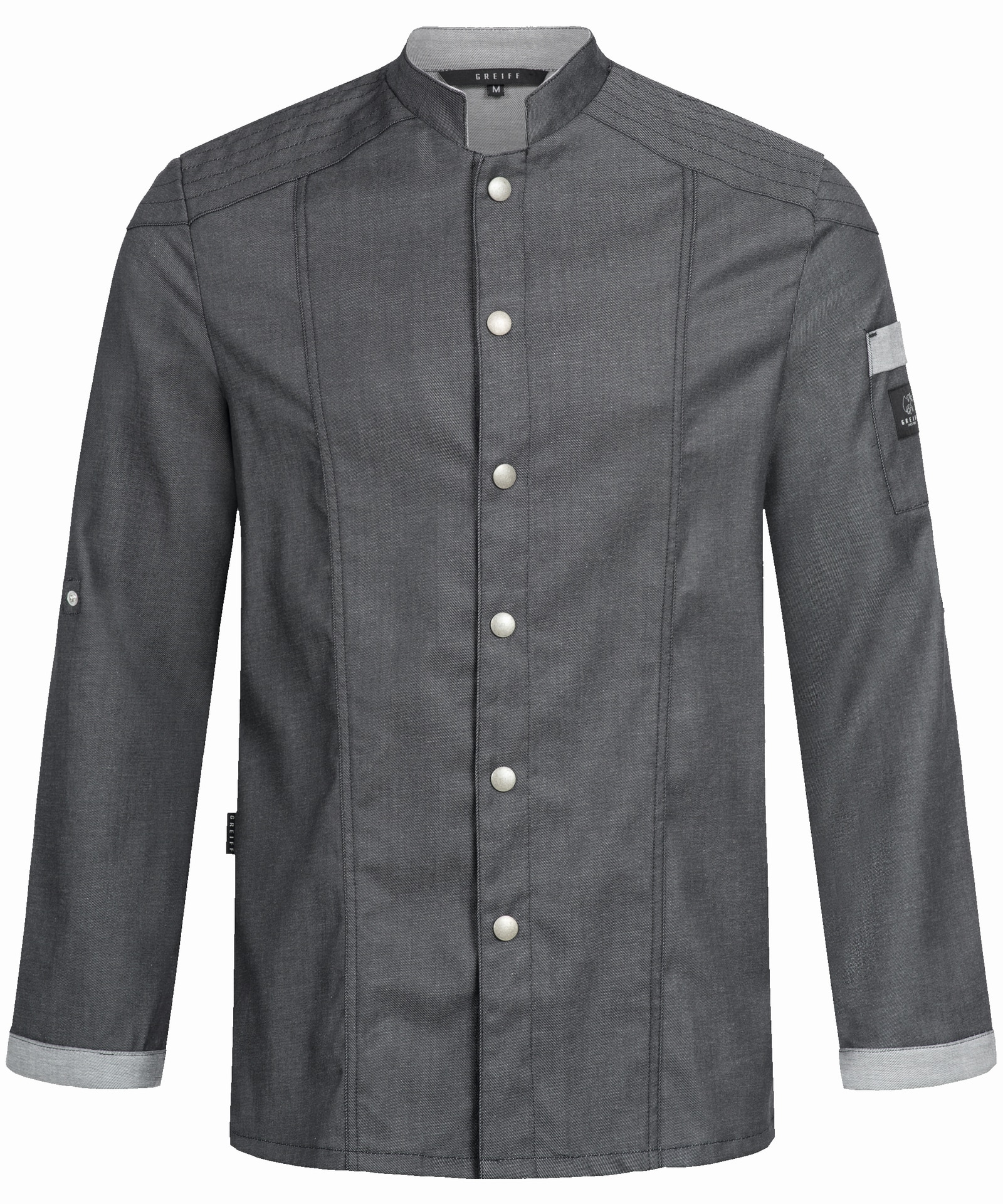 Die Herren-Kochjacke / Regular Fit aus der Greiff Cuisine Premium Kollektion, besticht durch den angesagten Bikerstyle. Durch die Metall-Druckknöpfe, die Passe im Rücken und die Schulterpasse mit Ziernähten bekommt das Modell das unverwechselbare Design.