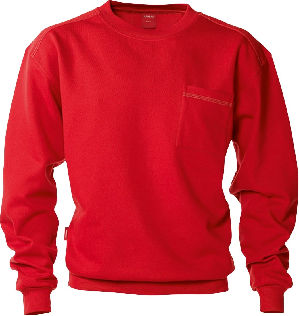 Farbecht / Rundhalsausschnitt / Brusttasche / Aufgeraute Innenseite / Industriewäsche geeignet gemäß ISO 15797 / OEKO-TEX® zertifiziert. Material: 65% Polyester, 35% Baumwolle.