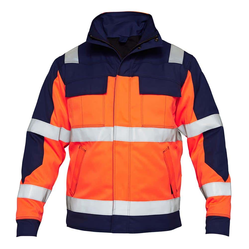 Winterjacke mit doppelter Knopfleiste, verdeckten Druckknöpfen und Metallreißverschluss vorne. Brusttaschen mit Patte und Klettverschluss, beide mit Handytasche. 2 Innentaschen mit Reißverschluss. 2 Seitentaschen mit Patte und Klettverschluss. Die Jacke ist mit flammhemmendem Steppfutter, flammhemmenden Reflektorstreifen sowie einer Membran ausgestattet, die Wasserdurchtritt verhindert. Praktische Details an Taschen und Nähten verhindern, dass Funken hängen bleiben. Antistatisch und flammhemmend.