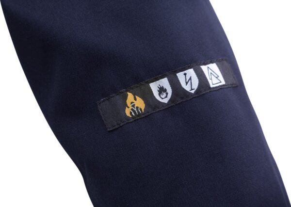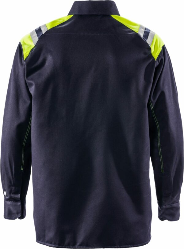 Über die Schulter führende Reflexstreifen / Verdeckte Druckknopfleiste / Armabschlüsse mit verdeckten Druckknöpfen / Verlängerte Rückenpartie / 2 Brusttaschen mit Patte und verdeckten Druckknöpfen – eine mit Stiftschlaufen / Metallfreies Kleidungsstück / Geprüft und zugelassen gemäß EN 61482-1-2 Klasse 1, EN 61482-1-1 EBT: 9,9 cal/cm² HAF: 78,0% (siehe Lichtbogentabelle für zertifizierte Bekleidungskombinationen für EN 61482-1-2 Klasse 2 und offenen Lichtbogen nach EN 61482-1-1), EN ISO 11612 A1 A2 B1 C1 F1, EN 1149-5, EN 13034 Typ PB[6] / Industriewäsche geeignet gemäß ISO 15797 / OEKO-TEX® zertifiziert. Material: 54% Modacryl, 44% Baumwolle, 2% Karbon. Inhärenter Flammenschutz.