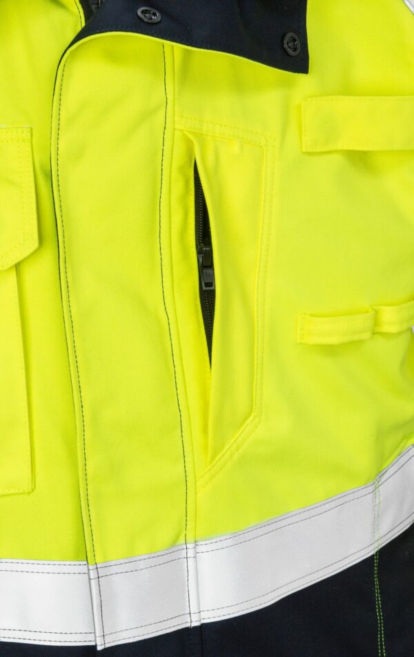 Mit Lenzing FR® / Schmutz-, öl- und wasserabweisend / Vollständig gefüttert: Fleece-Futter am Rumpf, weiches Steppfutter in den Ärmeln / Über die Schultern führende Reflexstreifen / Verdeckter Reißverschluss mit Druckknopfleiste bis zum oberen Kragenrand / Kragen mit Fleece-Futter / 2 Brusttaschen – eine geräumige mit verdecktem Druckknopf, D-Ring und Stiftschlaufe, die andere mit Reißverschluss / Knöpfe und Schlaufe für ein Arbeitsmesser auf der linken Brustseite / Mikrofon-Halter auf der linken Vorderseite / 2 Vordertaschen mit Fleece-Futter und verdeckten Druckknöpfen / Von außen zugängliche Kartentasche mit Handytasche (innen) / 2 Innentaschen – eine mit Knopf, die andere mit Handytasche mit Klettverschluss und Schlaufe für Kopfhörer / Elastische Ärmelinnenbündchen / Verlängerte Rückenpartie / Verstellbare Kordel an Unterkante / Reißverschluss im Futter ermöglicht Stickereien und Wärmetransfers / Geprüft und zugelassen gemäß EN 61482-1-2 Klasse 2, EN 61482-1-1 Hauptgewebe EBT: 26,4 cal/cm² HAF: 93,2% (siehe Lichtbogen-Tabelle für zertifizierte Bekleidungskombinationen für offenen Lichtbogen nach EN 61482-1-1), EN ISO 11612 A1 B1 C1 E2 F1, EN ISO 11611 A1 Klasse 1 (siehe Flamm- und Schweißtabelle für zertifizierte Bekleidungskombinationen), EN 1149-5, EN 13034 Typ PB [6], EN ISO 20471 Klasse 2 – Größe XS und Klasse 3 – Größe S-3XL und EN 342 / Zugelassen nach 25 Wäschen / Industriewäsche geeignet gemäß ISO 15797 / OEKO-TEX® zertifziert. Material: 45% Modacryl, 35% Baumwolle, 18% Polyamid, 2% Karbon. Fleece-Innenfutter: 50% Modacryl, 30% Baumwolle, 18% Polyester, 2% Karbon. Steppfutter: 40% Modacryl, 37% Viskose (flammhemmend), 22% Viskose, 1% Karbon. Inhärenter Flammenschutz.