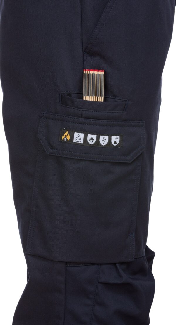Schmutz-, öl- und wasserabweisend / 2 Vordertaschen / D-Ring / Doppelt verstärkte Schrittnaht / 2 Gesäßtaschen mit Patte / Beintasche mit Patte und verdecktem Druckknopfverschluss, Handytasche mit Patte, Klettverschluss und D-Ring / Beintasche mit Patte / Zollstocktasche / Ergonomisch geformte Knie / Verstärkte Knietaschen, mit Öffnung innen, für höhenverstellbare Kniepolster / Metallfreies Kleidungsstück / Anpassbare Beinlänge: inkl. 5 cm Extralänge / Geprüft und zugelassen gemäß EN 14404 zusammen mit Knieschoner 124292, EN 61482-1-2 Klasse 1, EN 61482-1-1 EBT: 12,8 cal/cm² HAF: 84,2 % (siehe Lichtbogen-Tabelle für zertifizierte Bekleidungskombinationen für EN 61482-1-2 Klasse 2 und offener Lichtbogen nach EN 61482-1-1), EN ISO 11612 A1 B1 C1 E2 F1, EN ISO 11611 A1 Klasse 1 (siehe Flamm- und Schweißtabelle für zertifizierte Bekleidungskombinationen), EN 1149-5 und EN 13034 Typ PB[6] / Zugelassen nach 50 Wäschen / Industriewäsche geeignet gemäß ISO 15797 / OEKO-TEX® zertifiziert. Material: 45% Modacryl, 35% Baumwolle, 18% Polyamid, 2% antistatische Faser. Inhärenter Flammschutz. Verstärkung: 54% Modacryl, 44% Baumwolle, 2% antistatische Faser.