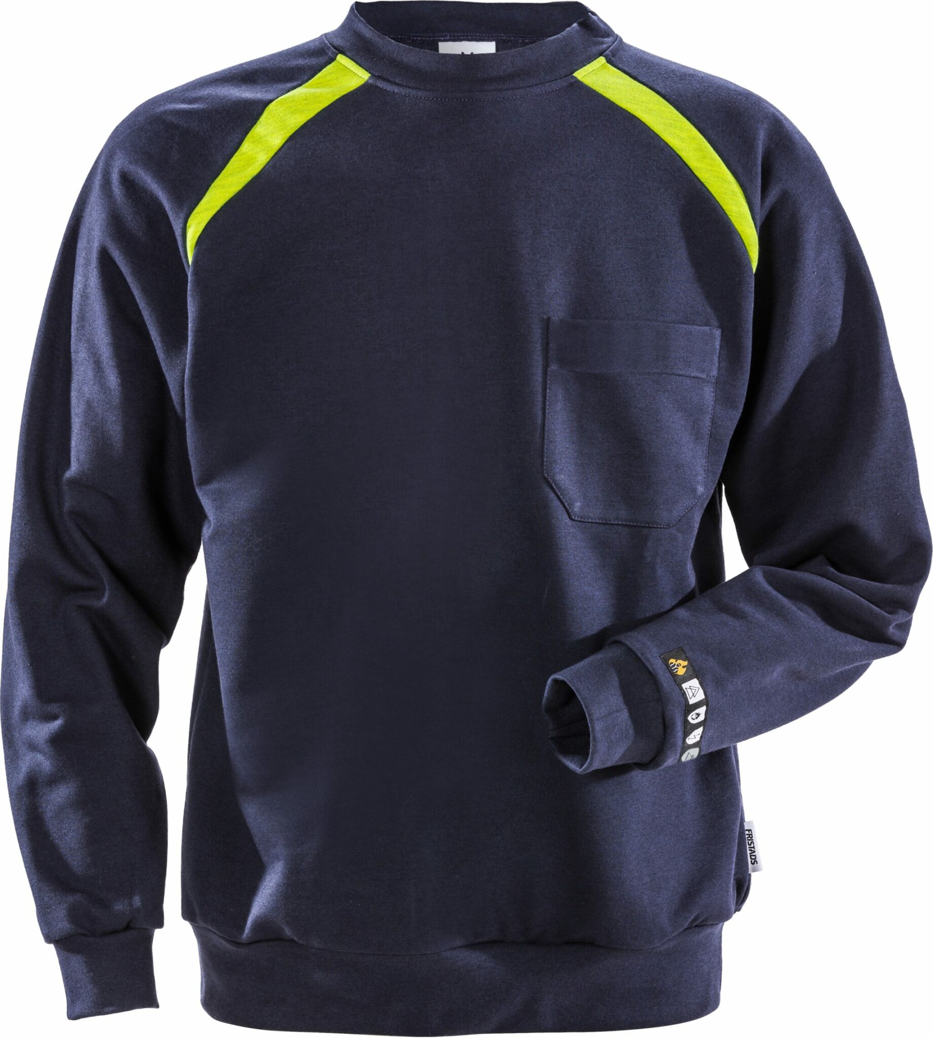 Bequemes Sweatshirt 984 SFLA aus Strickgewebe mit inhärentem Flammschutz. Strahlend gelbe Einsätze an den Schultern sorgen für eine bessere Sichtbarkeit.