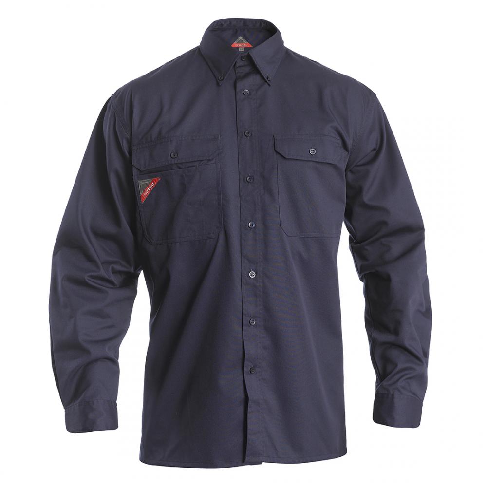 Hemd mit kurzen Ärmeln. Zwei Brusttaschen mit Patte. Eine aufgesetzte Brusttasche für Handy und Stifte. Bewegungsfalten im Rücken. Mit Knöpfen festgestellter Kragen.