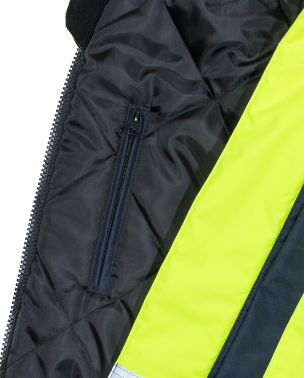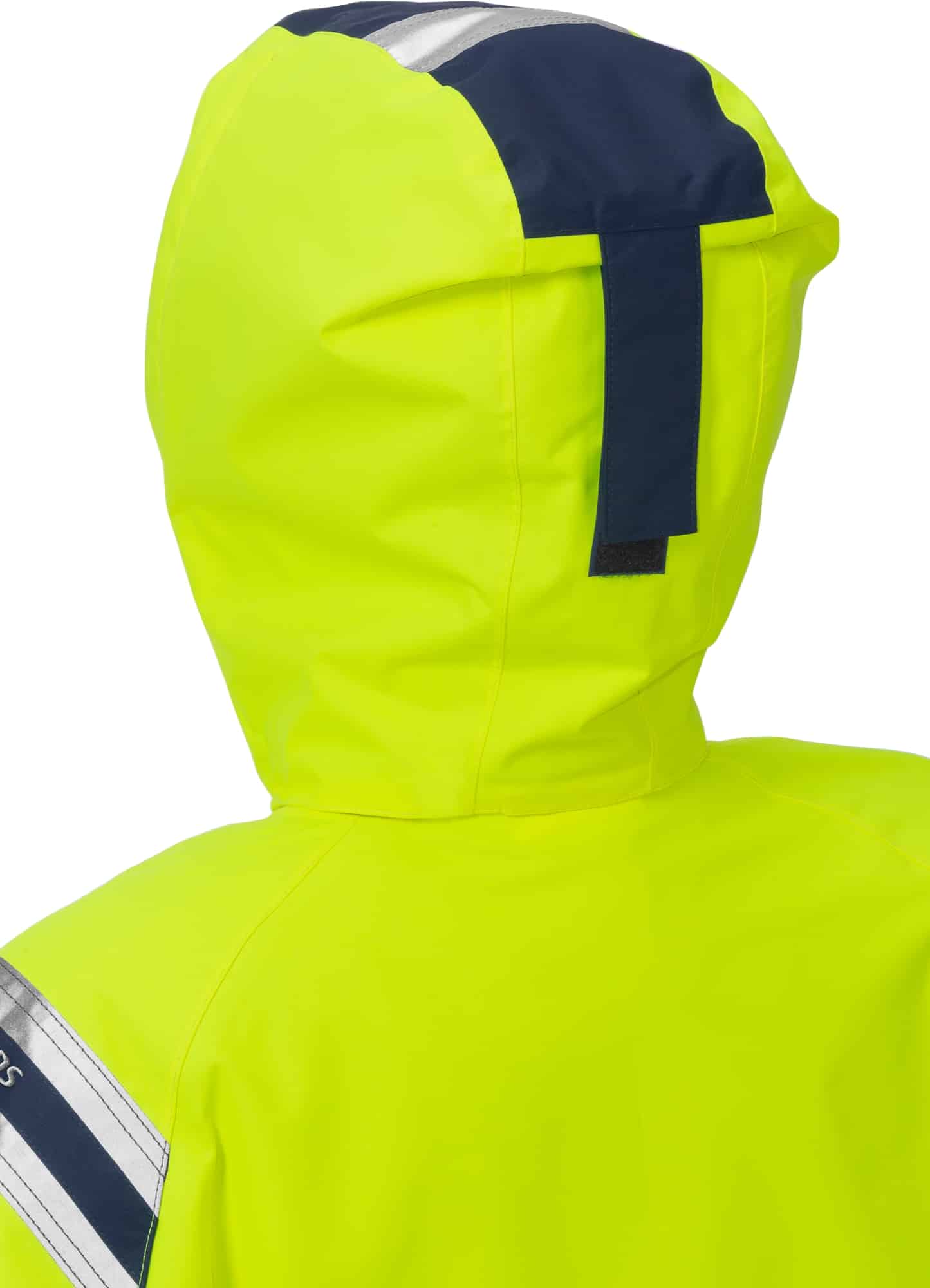 Airtech®, wasser- und winddicht sowie atmungsaktiv / Steppfutter / Abnehmbare und verstellbare, gefütterte Kapuze / Fleece-gefütterter Kragen / Reflektierende Details an den Schultern / Verdeckter Reißverschluss mit Druckknopfleiste bis zum oberen Kragenrand / 2 Brusttaschen mit Reißverschluss / Ausweistasche / Napoleontasche mit innenliegender Handytasche, auch bei geschlossenem Kleidungsstück zugänglich / 2 Fleece-gefütterte Vordertaschen mit Reissverschluss / 2 Innentaschen mit Reissverschluss / Belüftungsnetz im Armloch / Verstellbare Ärmelenden / Elastischer Innenbund mit Daumengriff / Verstellbarer Saum mit Kordelzug / verlängerte Rückenpartie / Reißverschluss im Futter ermöglicht Stickereien und Wärmetransfers / Wassersäule 10. 000 mm / Atmungsaktivität Airtech®-Material RET <12 / Geprüft und zugelassen gemäß EN ISO 20471 Klasse 2 – Größe XS und Klasse 3 – Größen S-4XL, EN 342 und EN 343 Klasse 3/1. Obermaterial erfüllt Klasse 3 für Wasserdampfdurchlässigkeit; EN 343 Klasse 3/3 / Farbe 271 ist zugelassen gemäß RIS-3279-TOM: 2016 Ausgabe 1 UK Railway Standard / Industriewäsche geeignet gemäß ISO 15797 / OEKO-TEX® zertifiziert. Material: Außenmaterial: 100% Polyester. Futter: 100% Polyester.