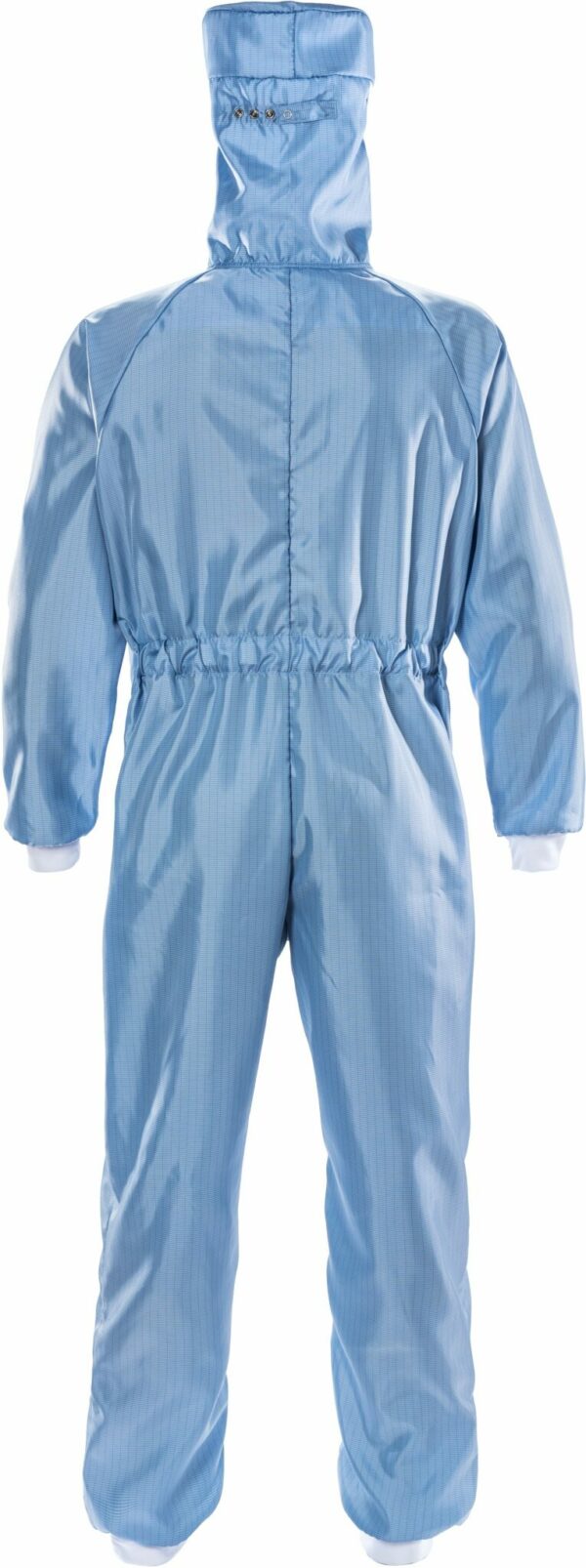 Verdeckter Reißverschluss / Verstellbare Kapuze mit Knöpfen / Elastische Bündchen an Arm- und Beinabschlüssen / Verstellbarer elastischer Hosenbund / Raglan-Ärmel / Undurchlässige Tunnelnaht / Autoklavierbar / Geeignet für Reinräume der ISO Klasse 3 / OEKO-TEX® zertifziert. Material: 97% Polyester, 3% Karbon.