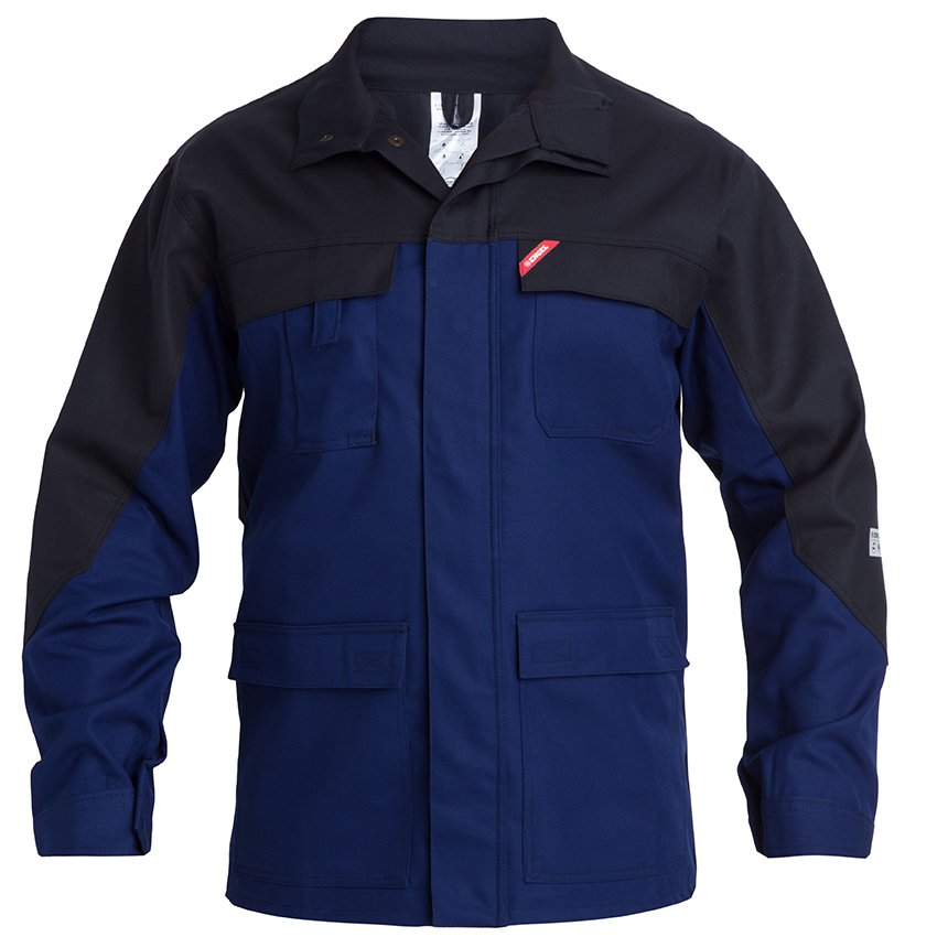 Jacke mit doppelter Knopfleiste und verdeckten Druckknöpfen vorne. Brusttaschen mit Patte und Klettverschluss, die Rechte mit Handytasche, zwei Innentaschen mit Reißverschluss, zwei Seitentaschen mit Patte und Klettverschluss, Manschetten mit Klettverschluss. Eine Rückenfalte sorgt für bessere Bewegungsfreiheit. Funktionelle Details bei Taschen und Bund verhindern das Festsetzen der Funken. Antistatisch, flammhemmend und schützend vor Aerosolen, Spray und leichten Spritzern von Chemikalien.