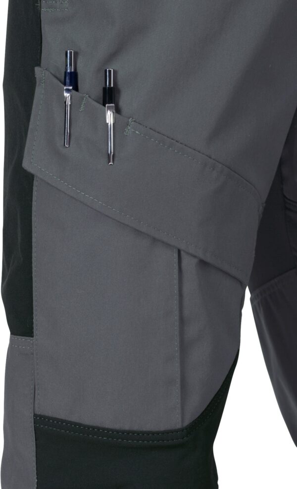 4-Wege-Stretch-Einsätze am Rücken und an den Knien / D-Ring / Breite Gürtelschlaufe in Rückenmitte / 2 Vordertaschen / Tasche auf der Seitennaht mit verdecktem Reißverschluss / 2 Gesäßtaschen mit verdecktem Reißverschluss / 2 Beintaschen vorne mit Patte und Klettverschluss – eine mit Handytasche und Stifttaschen / Ergonomisch geformte Knie / Verstellbare Beinabschlüsse / OEKO-TEX® zertifiziert. Material: 65% Polyester, 35% Baumwolle. Stretch-Material: 91% Polyamid, 9% Elasthan.