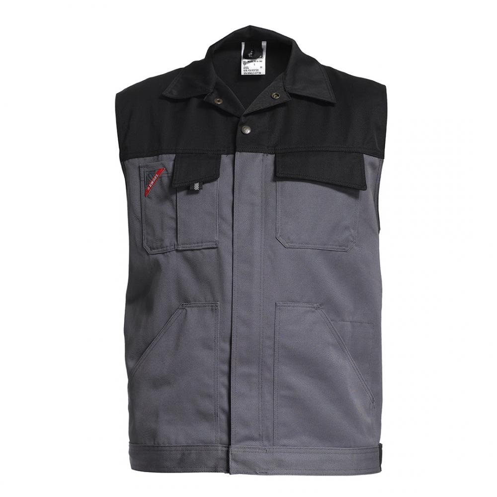 Serviceweste mit durchgehendem Kunststoffreißverschluss. Dunkel gefärbte Druckknöpfe. Brusttasche mit Patte und Klettverschluss links. Offene Brusttasche mit verschließbarer Handytasche rechts. Zwei Eingrifftaschen. Dreifach Kappnähte.