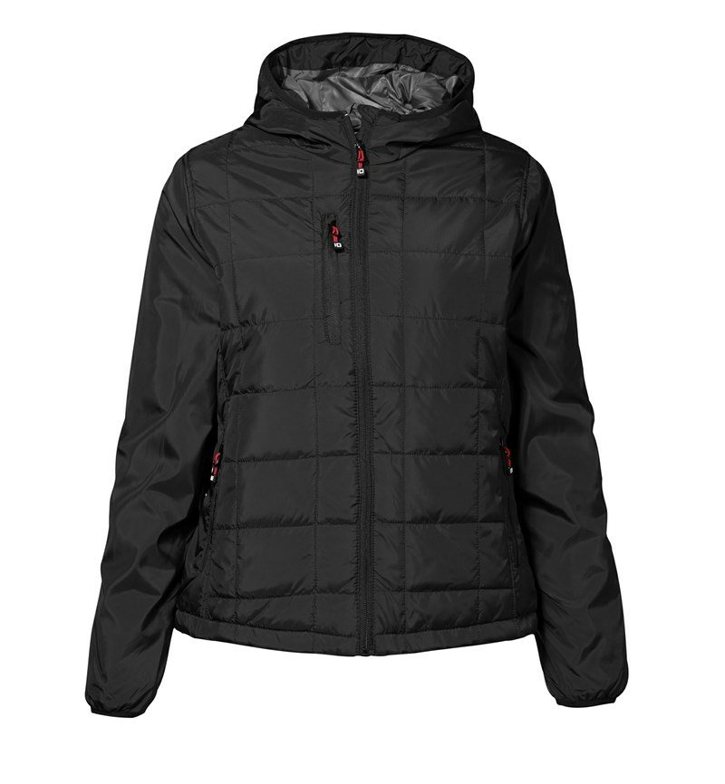 Wattierte Jacke mit Kapuze. Zwei Schubtaschen und Brusttasche mit Reißverschluss sowohl als auch Innentasche. Verstellbar am Bund. Leicht figurbetont.