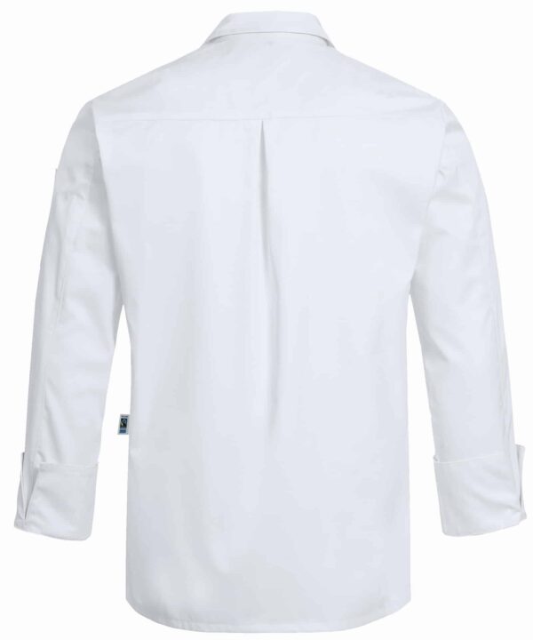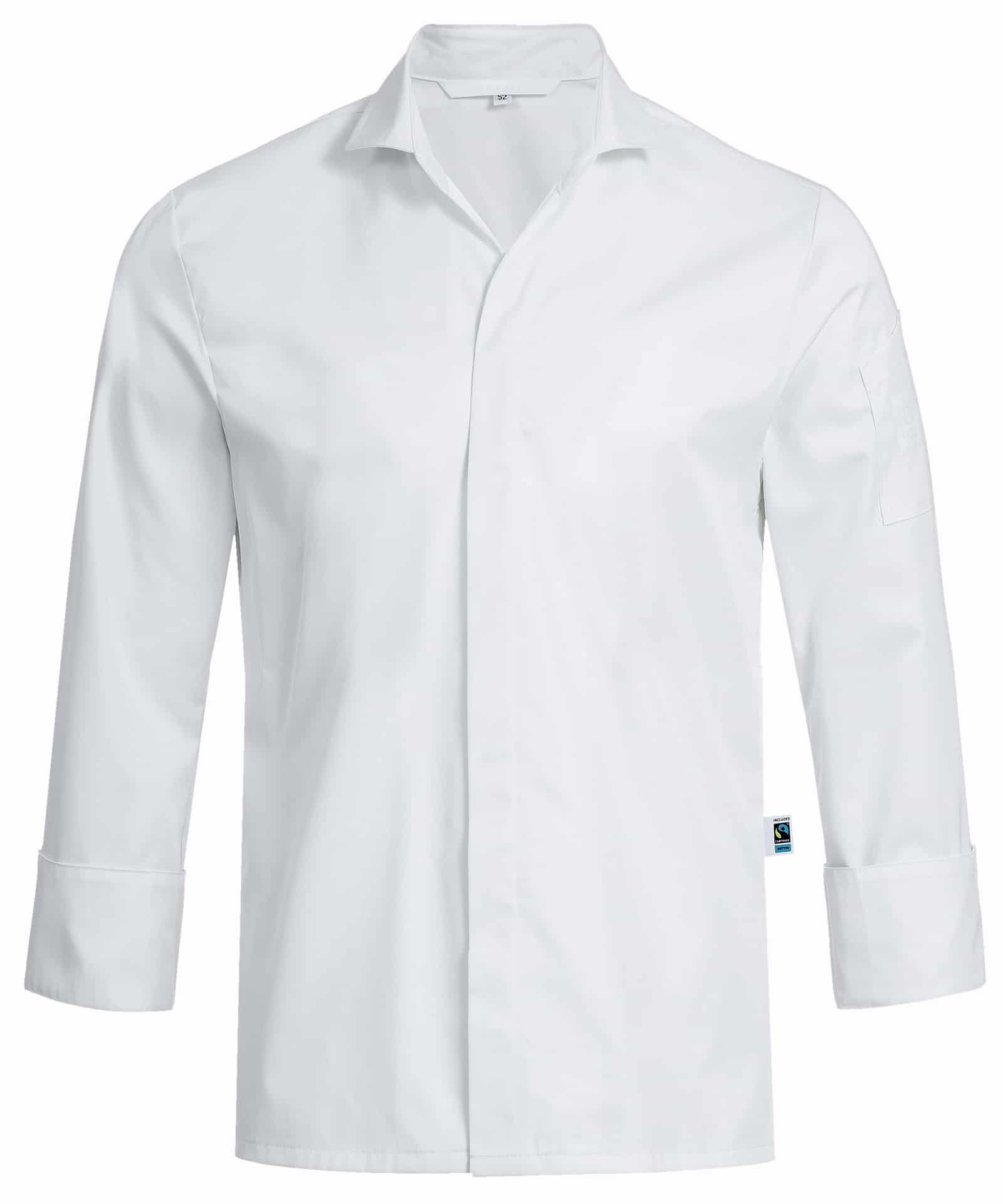 Das weiße Herren-Kochhemd mit dem V-Ausschnitt besteht zu 100% aus Baumwolle, diese wird von Fairtrade Produzenten angebaut.