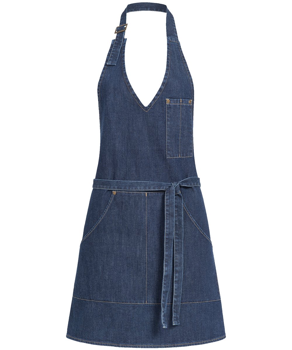 Diese Latzschürze mit V-Ausschnitt im Denim Look sorgt für einen modernen Look.