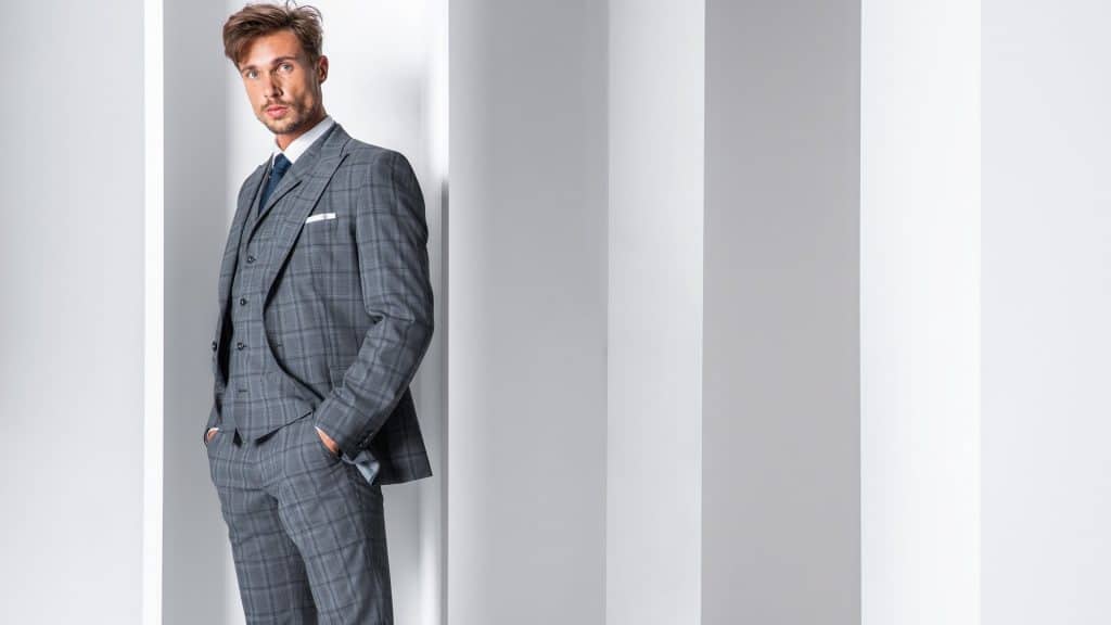 Die Vier-Knopfleiste und der weiche Stoffrücken verhindern das Verrutschen. Dementsprechend wird das Gefühl von Sicherheit geboten. Zudem schaffen die beiden Leistentaschen und die Brustleistentasche klassische Designelemente. Ein richtiger Eyecatcher ist die Weste kombiniert mit dem glencheck-grauem Sakko, der glencheck-grauen Hose mit einem weißen Hemd mit einer roten Fliege.