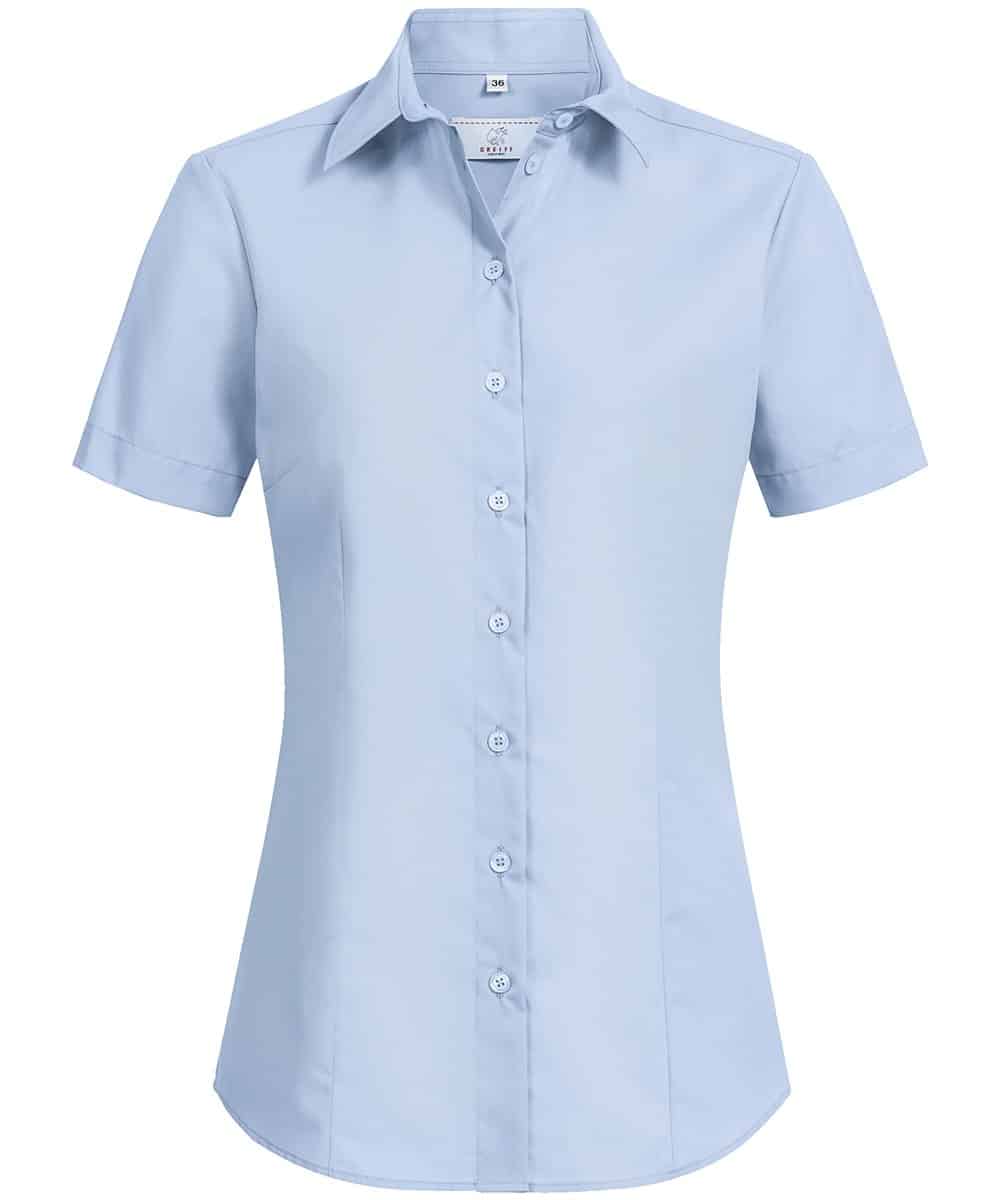 Die kurzärmlige Damen-Bluse/ Regular Fit, aus der Greiff Basic Kollektion ist besonders strapazierfähig und pflegeleicht. Durch das robuste Obermaterial eignet sich dieses Kleidungstück optimal für Branchen in denen das Team nicht nur ansprechend, sondern auch praktisch gekleidet sein sollte. Die stretch Eigenschaft sorgt für ein bequemes Tragegefühl. Das Modell in Regular Fit ist leicht tailliert geschnitten und steht nahezu jeder Dame. Obendrein besteht das Gewebe zu 100 Prozent aus Baumwolle. Dieses Material nimmt die Feuchtigkeit der Haut auf und fühlt sich dementsprechend sehr angenehm an. Außerdem ist das Produkt in den Farben blau und weiß, jeweils in den Größen 34 bis 52 erhältlich.