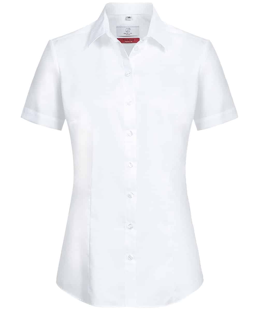 Die Damen-Bluse / Regular Fit, aus der GREIFF Premium Kollektion besticht durch die neue Non Iron Technologie. Diese sorgt dafür, dass das Kleidungsstück nicht gebügelt werden muss, aber trotzdem glatt und ordentlich ausschaut. Zudem bewirkt die verarbeite Elasthanfaser eine besondere Dehnfähigkeit und Rücksprungkraft. Diese Eigenschaften sind verantwortlich, dass Bewegungen nicht eingeschränkt werden. Die Regular Fit Variante ist kurzärmlig und ausgestattet mit einem Kent-Kragen. Zudem ist diese leicht figurbetont geschnitten und ideal für nahezu jede Figur. Verfügbar ist das Produkt in den Größen 34 bis 52. Obendrein wiegt das Gewebe nur 140 g/m² und verspricht demzufolge einen hohen Tragekomfort.