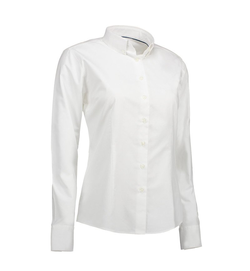 Oxford Damenbluse mit Button-Down-Kragen in verbesserter Easy Care-Qualität. Garngefärbtes Pinpoint Oxford-Gewebe. – Damenbluse mit langen Ärmeln. – Kontrastfarbene Paspel innen im Halsausschnitt. – Leicht tailliert. – 70 % Baumwolle / 30 % Polyester. – S, M, L, XL, 2XL, 3XL, 4XL