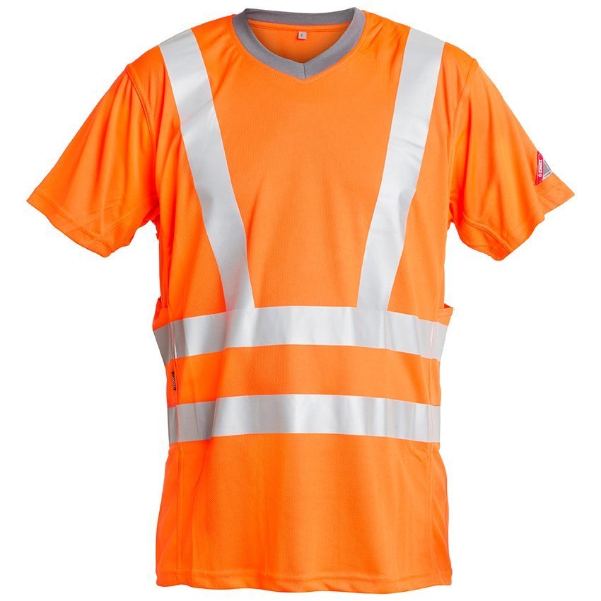 Einfarbiges T-Shirt, angenehm weich. Handytasche an der Seitennaht. Mit Reflexstreifen über der Schulter und um die Taille. Mit gestricktem Halsbündchen und kurzen Ärmeln. LOXY® Stretchreflexe für verbesserten Tragekomfort. Bekleidungsklasse 2