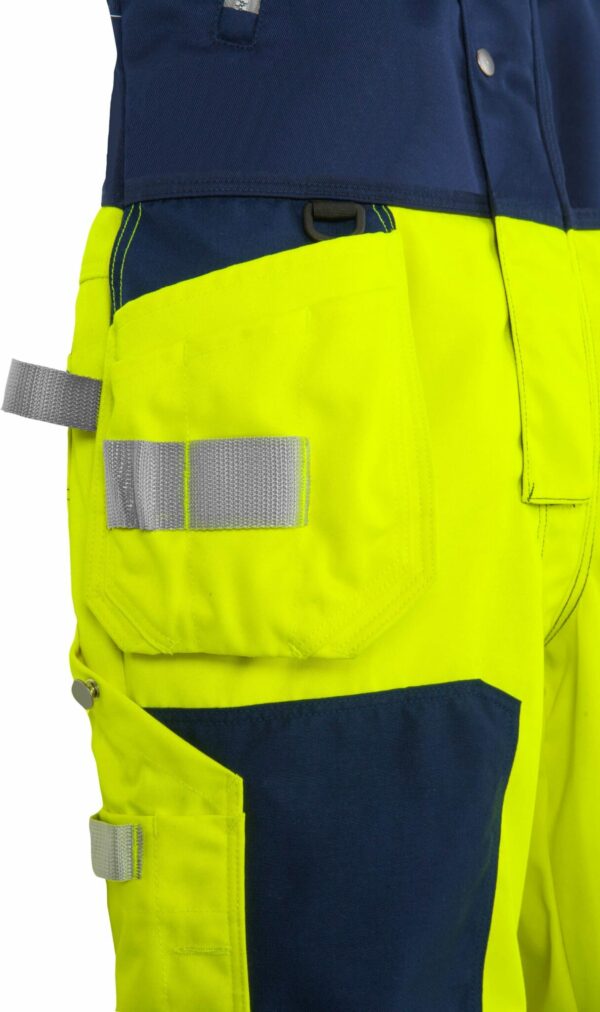 Schmutz-, öl- und wasserabweisend / Doppelt abgesteppte Reflexstreifen / Verdeckter 2-Wege-Reißverschluss / 2 lose hängende Brusttaschen, die mit Knopf fixiert werden können, beide mit Knopf und Schlaufe für ein Arbeitsmesser – die eine mit Patte, Druckknopf und D-Ring, die andere mit Druckknopf und Stifttasche / Elastische Hosenträger / 2 CORDURA®-verstärkte, einsteckbare, lose hängende Außentaschen – eine mit extra Tasche, die andere mit 3 kleinen Taschen und Werkzeugschlaufen / D-Ring / 2 Vordertaschen / Doppelt verstärkte Schrittnaht / 2 Gesäßtaschen – eine mit Patte und Klettverschluss / Beintasche mit Handytasche, D-Ring und Ausweistasche / Hammerschlaufe / CORDURA®-verstärkte Zollstocktasche mit Werkzeugtasche sowie 2 Knöpfe und Schlaufen für 2 Arbeitsmesser / Verstellbare Bundweite / Verstärkte Oberschenkel in Kontrastfarbe / Ergonomisch geformte Knie / CORDURA®-verstärkte Knietaschen, mit Öffnung innen, für höhenverstellbare Kniepolster / CORDURA®-verstärkte Beinabschlüsse / Geprüft und zugelassen gemäß EN ISO 20471 Klasse 2 und EN 14404 (in Kombination mit Kniepolster 124292) / Zugelassen nach 50 Wäschen / Industriewäsche geeignet gemäß ISO 15797 / OEKO-TEX® zertifiziert. Material: Fluoreszierendes Material: 80% Polyester, 20% Baumwolle. Übriges Material: 65% Polyester, 35% Baumwolle. Verstärkungen: 100% Polyamid.